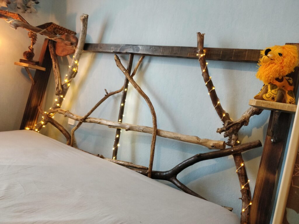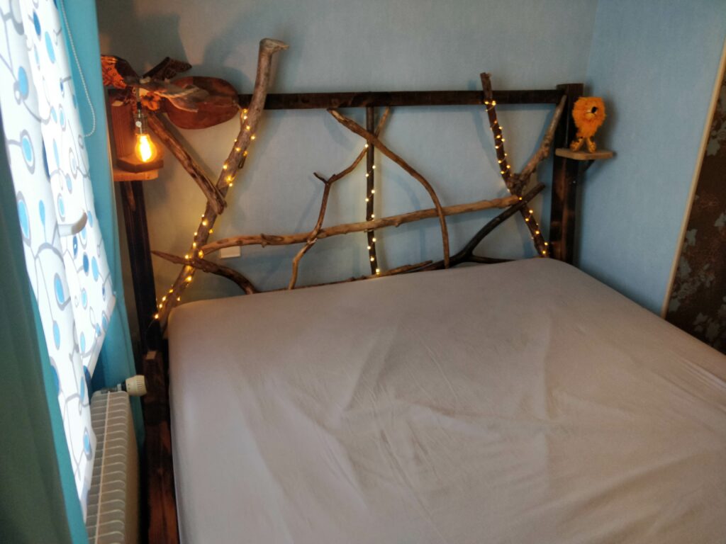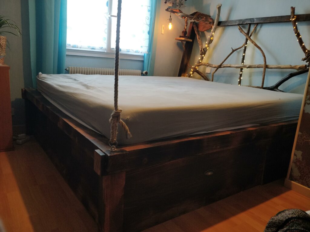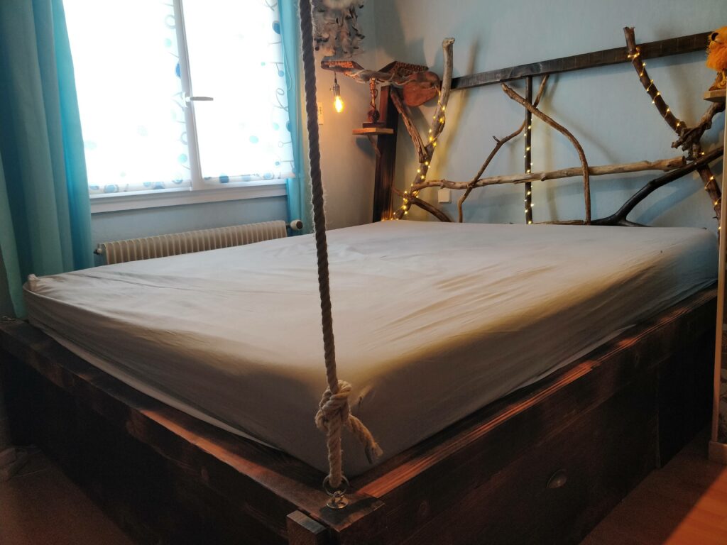 Un lit pour matelas de 180cm par 200cm crée sur mesures pour un Chat’man qui souhaite rester en lien avec la nature même pendant son sommeil. Quelques branches en bois flotté pour la tête de lit, des poutres et plances en pin pour la structure, le tout passé dans les flammes pour l’effet « brulé » .