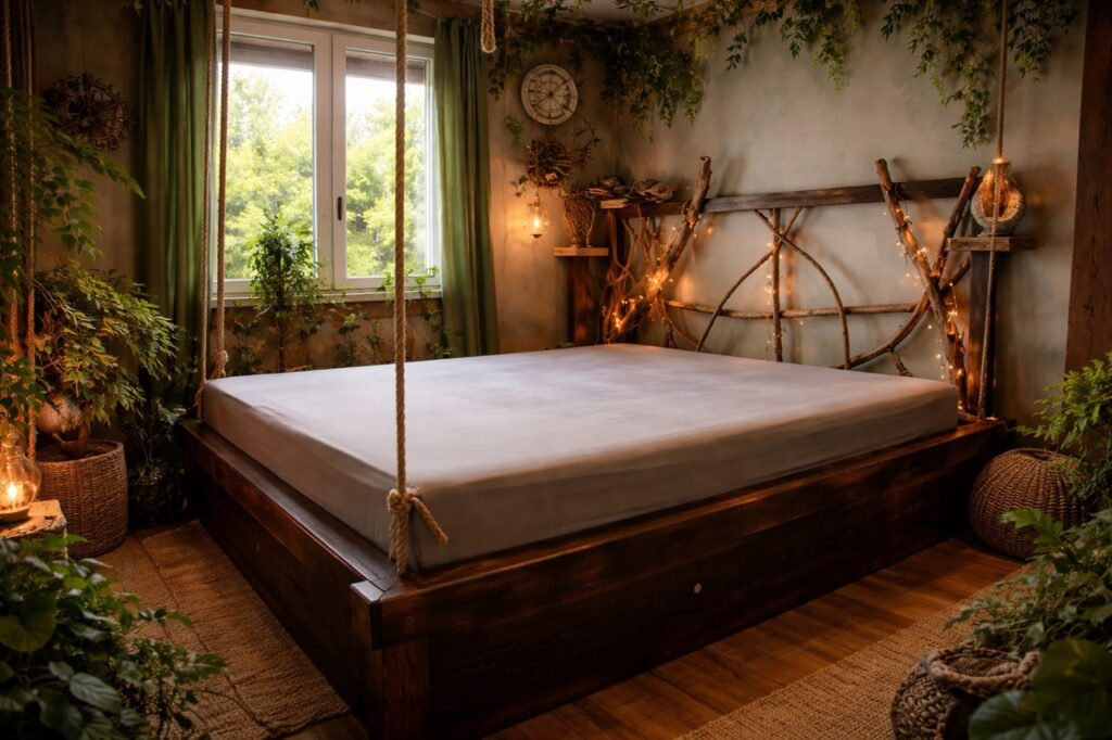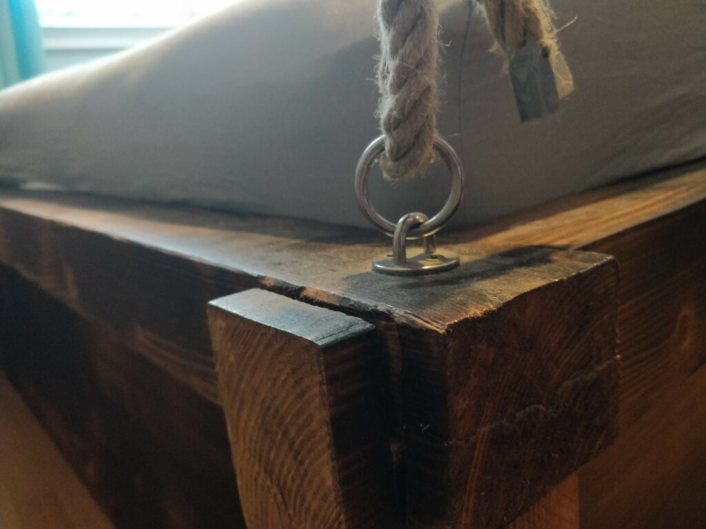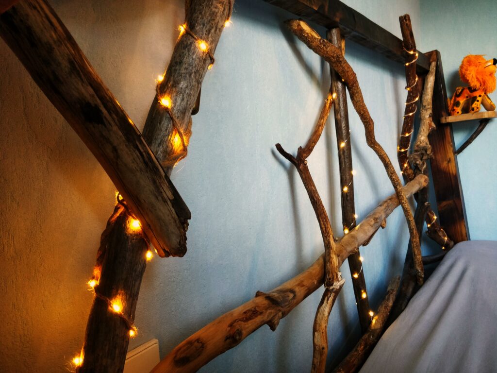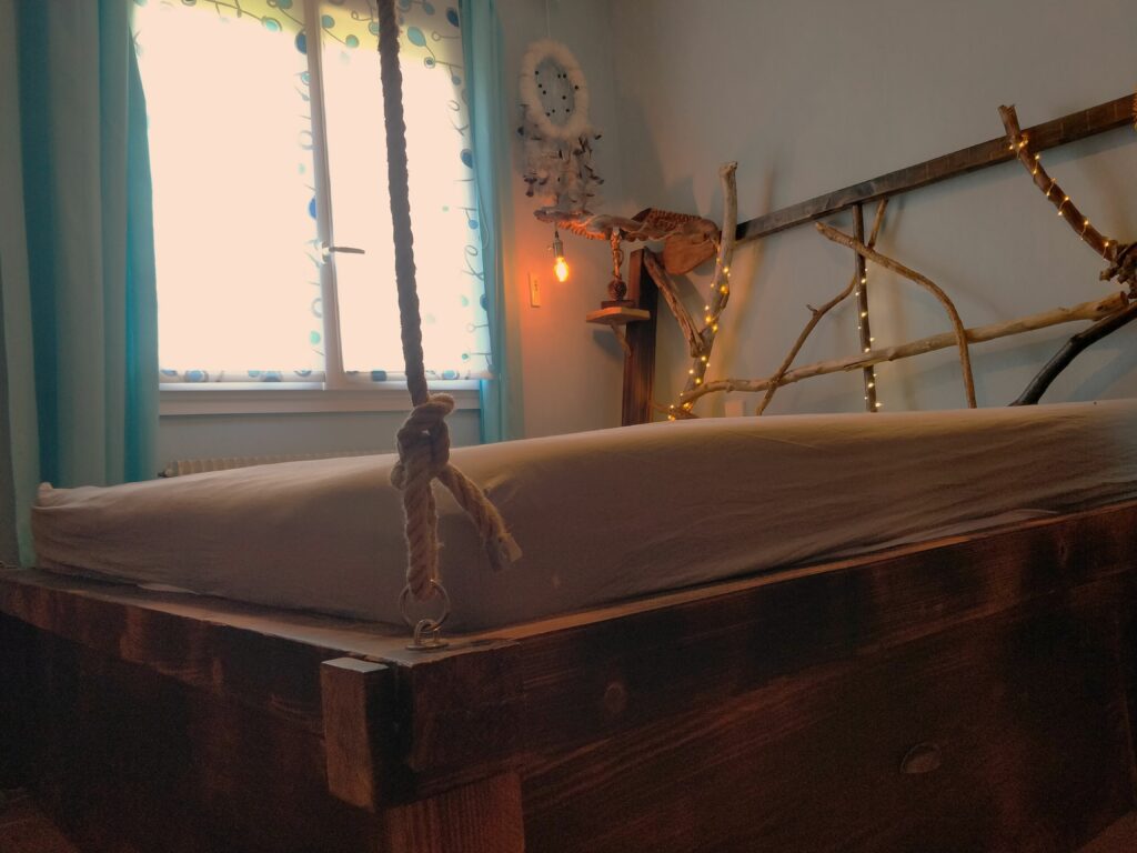 Un lit pour matelas de 180cm par 200cm crée sur mesures pour un Chat’man qui souhaite rester en lien avec la nature même pendant son sommeil. Quelques branches en bois flotté pour la tête de lit, des poutres et plances en pin pour la structure, le tout passé dans les flammes pour l’effet « brulé » .